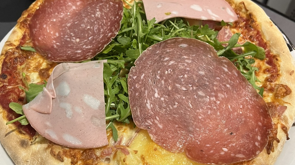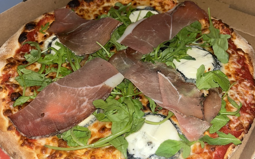 tomate, pomme de terre, jambon, fromage, raclette, olives, roquette, golfeta, mortadelle pistache