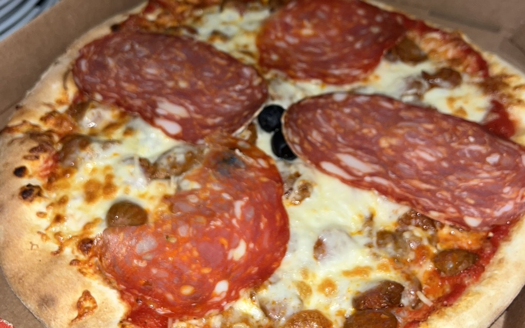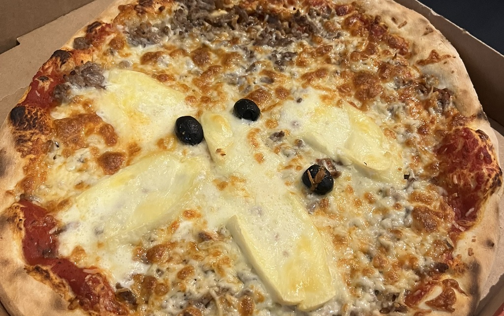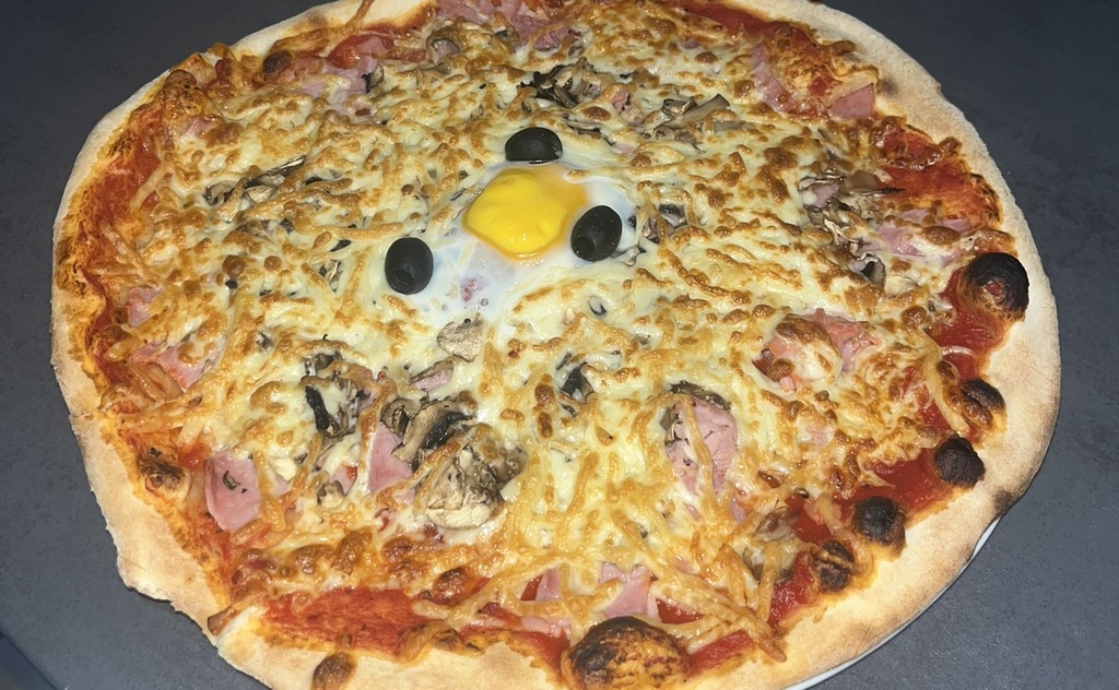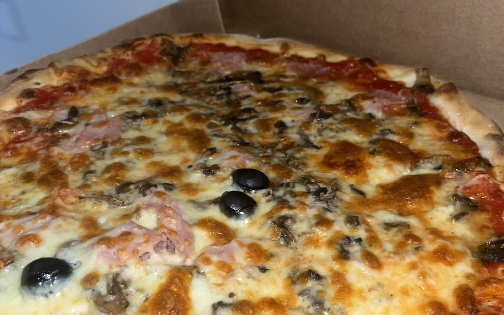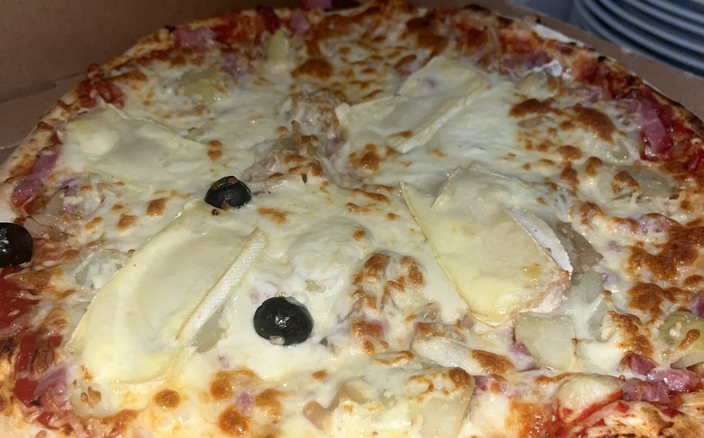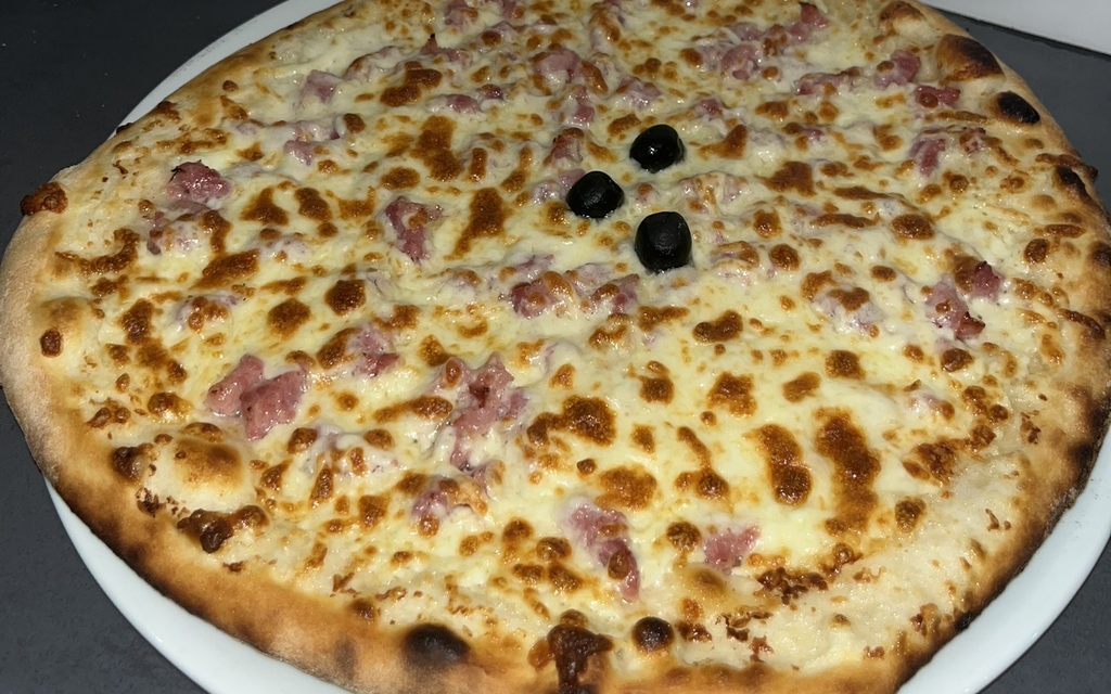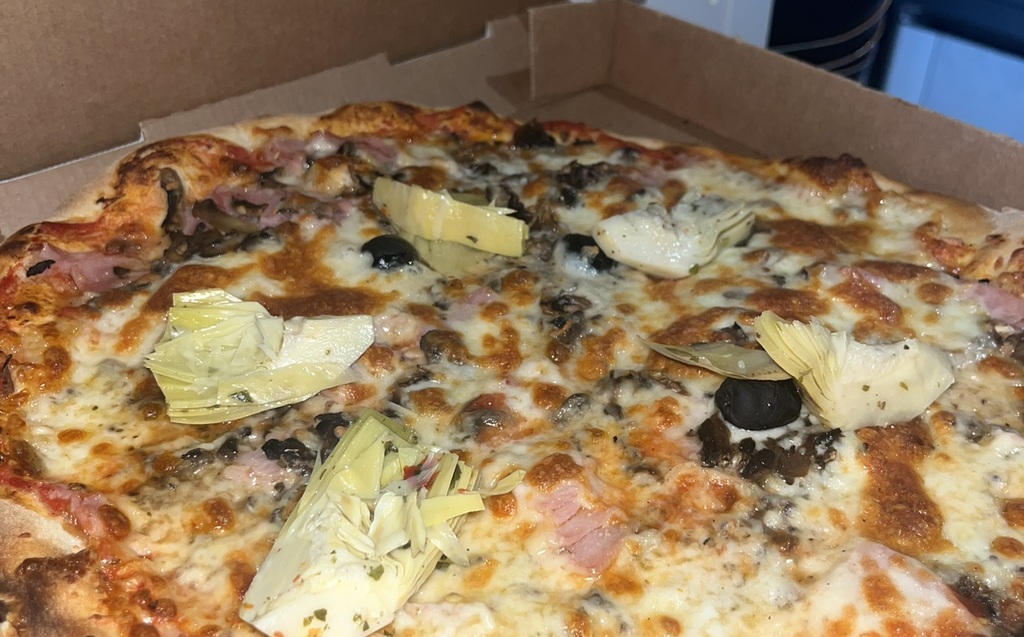 tomate, champignons, jambon, cœur d’artichaut mariné, olives, fromage