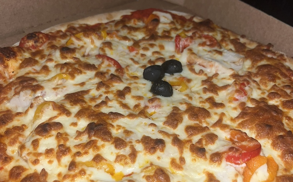 tomate, poulet, oignons, poivrons marine, fromage, olives