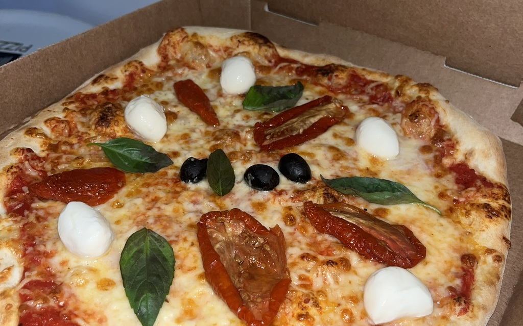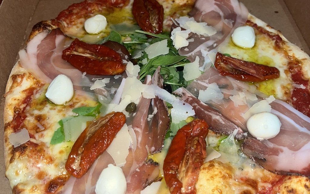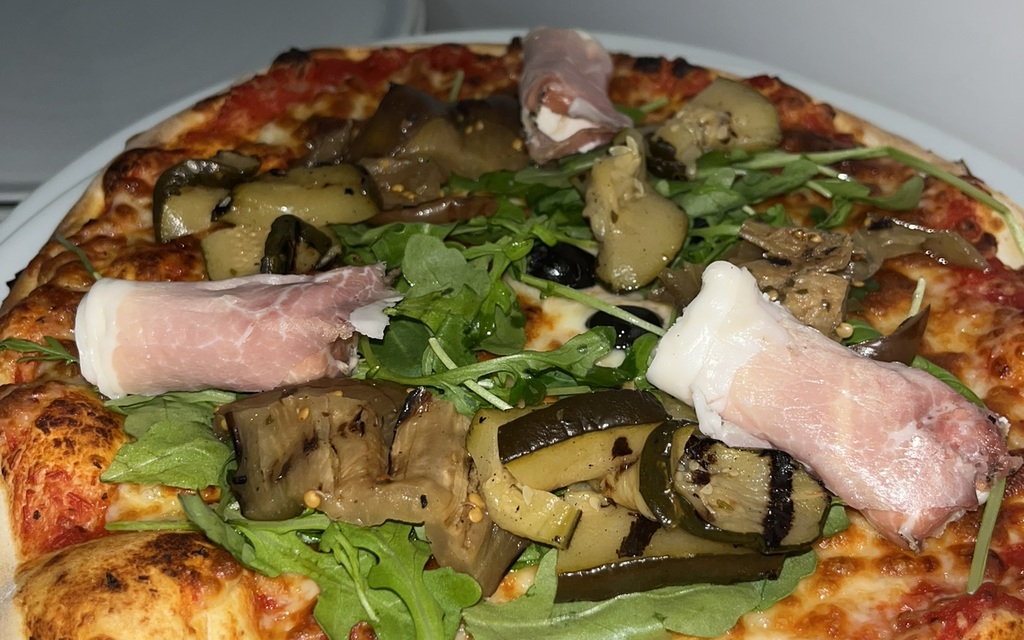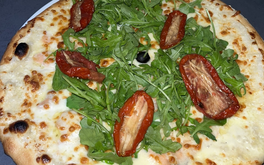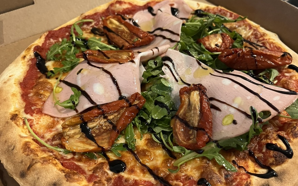 tomate, fromage, olives, roquette, tomate confite, mortadelle pistache, huile de truffe, crème de vinaigre balsamique.